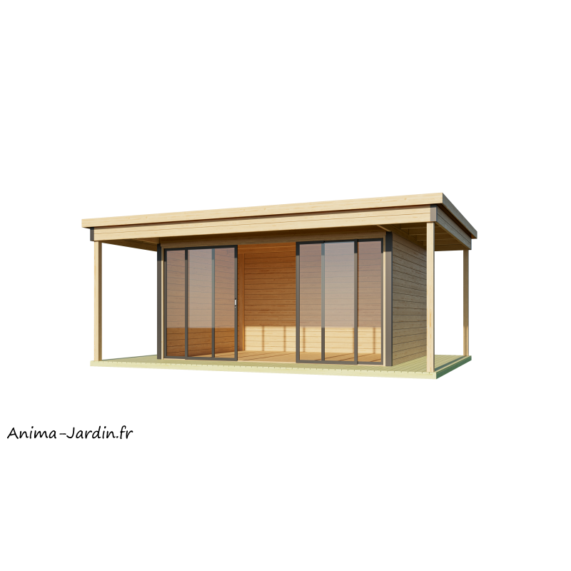 Abri en bois d'une surface intérieure de 16,74 m². L'épaisseur des parois est de 44 mm. L'abri possède des baies vitrées double vitrage pour une très bonne isolation et une très grande luminosité intérieure. Le plancher en bois massif est inclus.