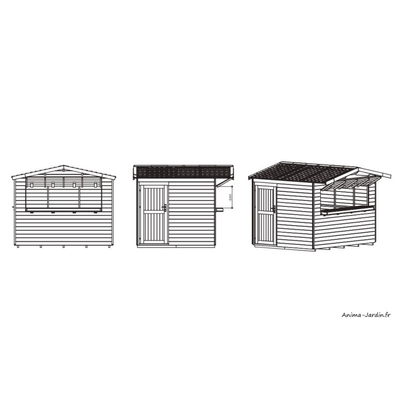 Super chalet de vente avec toit plat et une surface de 9,3 m². Ce petit abri vous permet de créer un espace de vente chaleureux. Utilisez-le également lors des marchés de Noël afin de mettre en valeur vos produits.