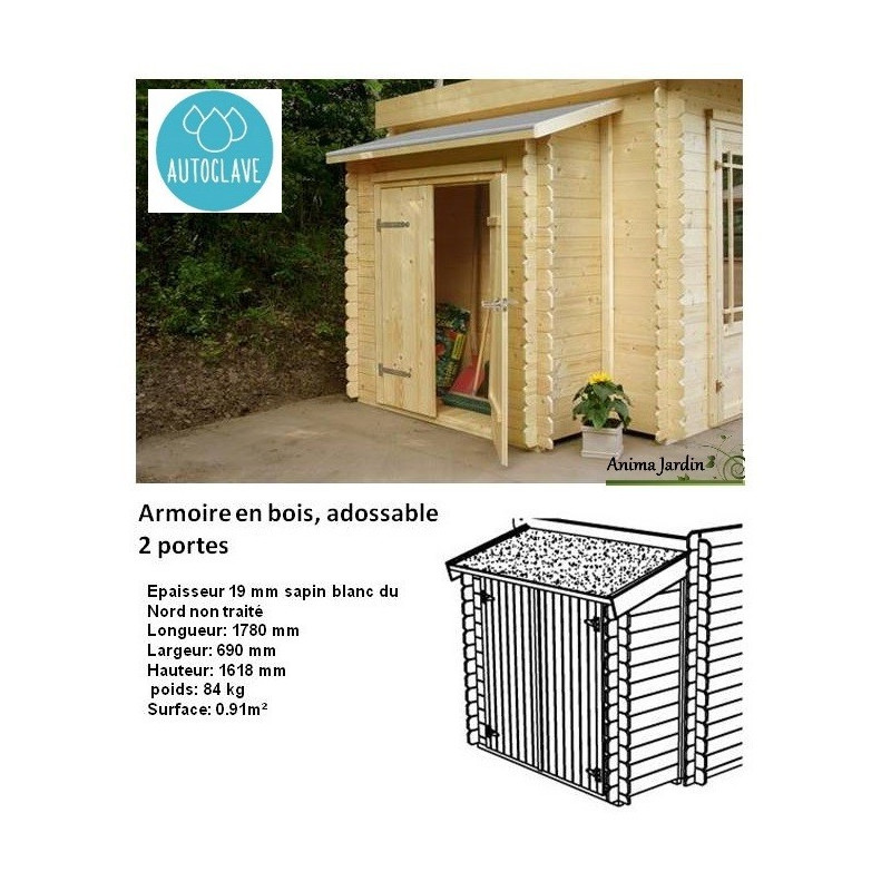 Superbe armoire de rangement 19 mm, remise à outils, à adosser contre un abri de jardin. Double portes. Montage par emboitement. Pour stocker l'outillage, tondeuse, barbecue, vélo. Sécurité renforcée grâce à sa porte robuste.