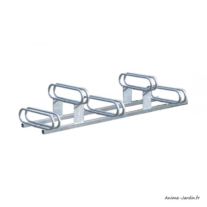 Ce support pour vélos en aluminium avec 5 emplacements décalés est parfait pour éviter que les guidons des vélos ne s'entrechoquent, 2 emplacements sont décalés en hauteur. Support utilisable des deux côtés.