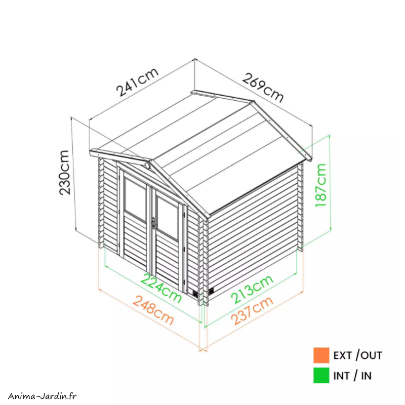 La solidité de cet abri est assurée par des madriers robustes de 28 mm, assurant une structure fiable et résistance aux intempéries. Son toit à double pente, incliné à 19°, non seulement confère un aspect élégant à l'ensemble, mais offre également une protection optimale contre les éléments extérieurs tels que la pluie et la neige.