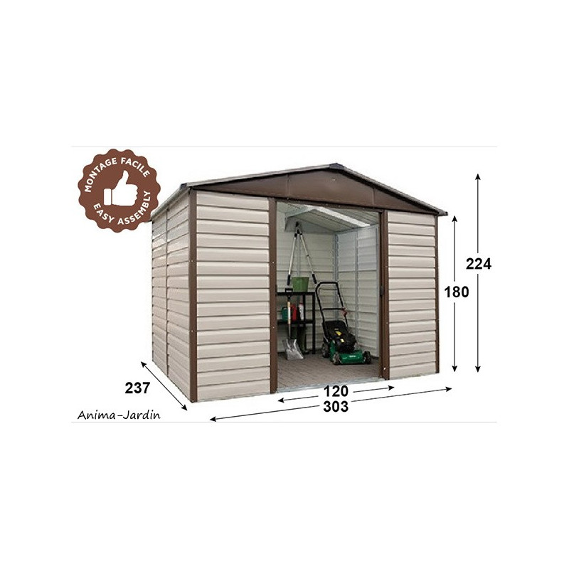 Trigano et Yardmaster vous propose leur gamme "Métal Beige", un coloris beige et chocolat qui s'accordera parfaitement aux teintes naturelles de votre extérieur. Cet abri de jardin d'une surface utile de 5,11 m² peut vous servir comme zone de stockage pour y ranger vos équipements de jardin, votre tondeuse ou bien vos vélos. Montage facile.