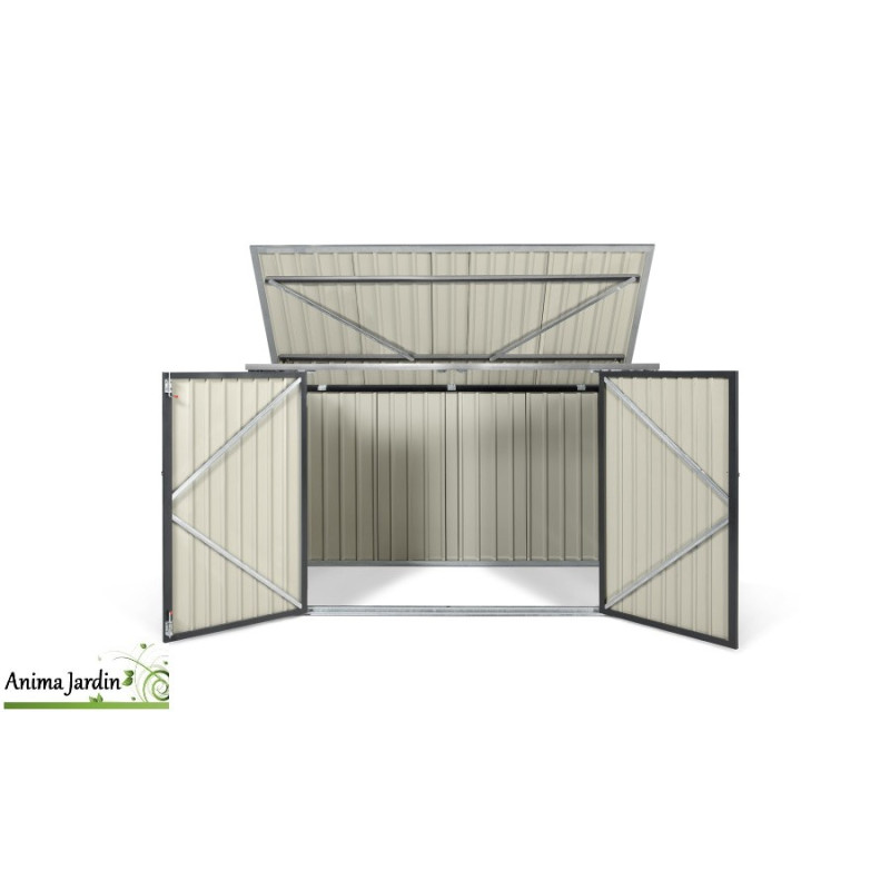 Coffre en métal pour le rangement de vos vélos. Ce coffre est équipé de 4 rails permettant de garder vos vélos au sec. Sa double porte vous permet de ranger très facilement vos vélos à l'intérieur du coffre. Pas d'entretien nécessaire, l'acier galvanisé à chaud permet une résistance à la corrosion. Assemblage facile.