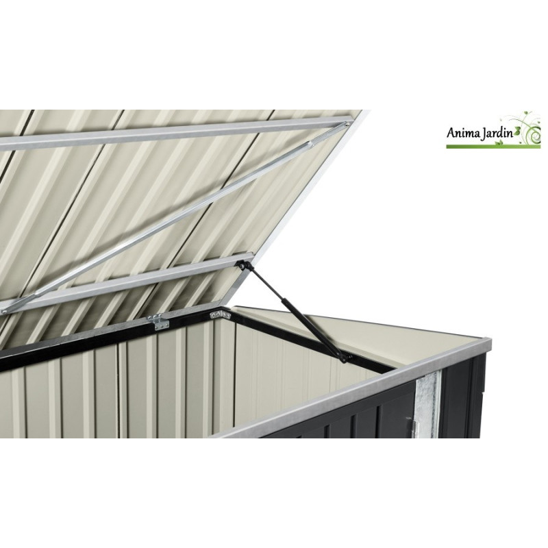 Avec des dimensions hors tout de L.210 x l.105 x H.130 cm et des dimensions intérieures de L.197 x l.92,70 x H.125,5 - 111,7 cm, cet abri offre un espace de stockage efficace de 1,82 m². La porte spacieuse, mesurant L.150 x H.121 cm, permet un accès simple à l'intérieur, tandis que l'ouverture du couvercle de 64 cm ajoute une commodité supplémentaire pour le rangement.