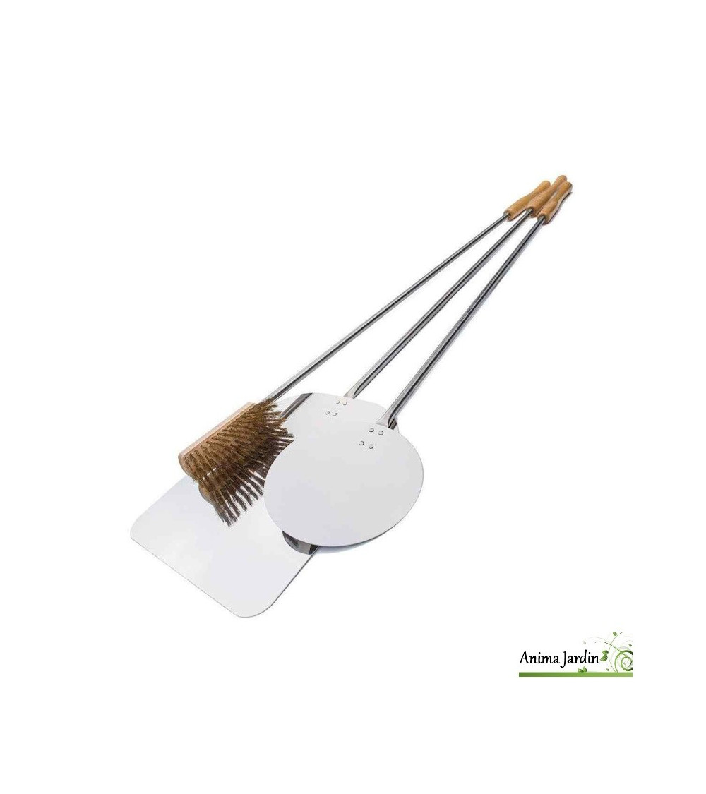 Ce pack complet d'ustensiles est l’indispensable des amateurs de cuisson au feu de bois. Il comprend : une pelle à pizza rectangulaire, une pelle ronde et une brosse à fils laiton – chacun d’une longueur de 90 cm pour manipuler aisément vos préparations même en pleine chaleur.
