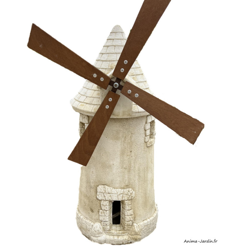 Superbe petit moulin de Jardin pour votre décoration de jardin. Son mouvement donnera de l'animation dans votre jardin. Béton coulé, peint à la main, le roulement de la Roue portant les ailes est semblable au mécanisme des roulements à billes de vélo.