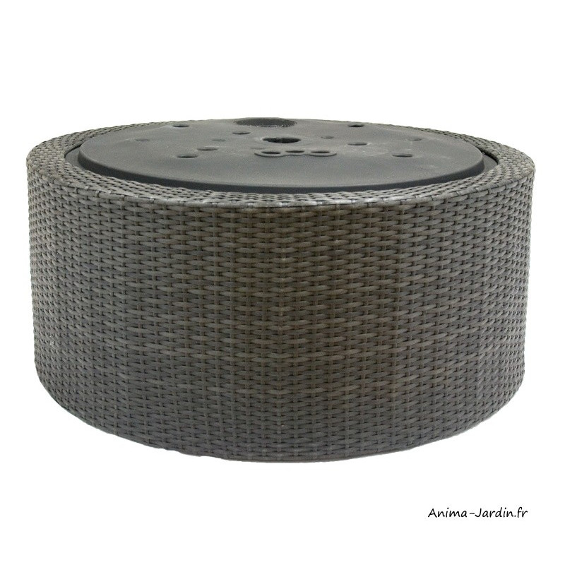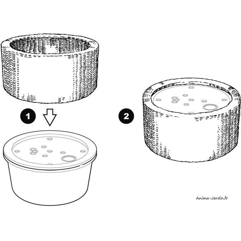 Wicker II est un habillage tressé et renforcé par du métal. Il permet de dissimuler une petite fontaine ou un jeu d'eau rond de 88 cm de diamètre pour une contenance de 150 L.