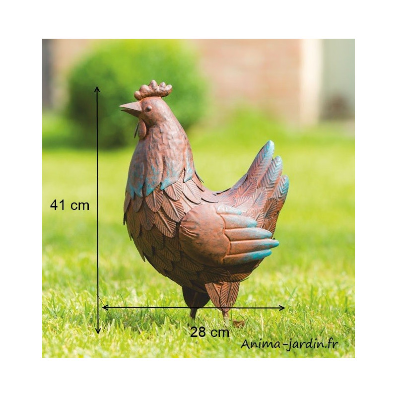 Plongez dans la découverte de cette magnifique poule aux teintes orangées éclatantes. Façonnée à partir de métal de qualité, cette sculpture de 33 cm de hauteur apportera une touche de réalisme et de vivacité à votre espace extérieur.