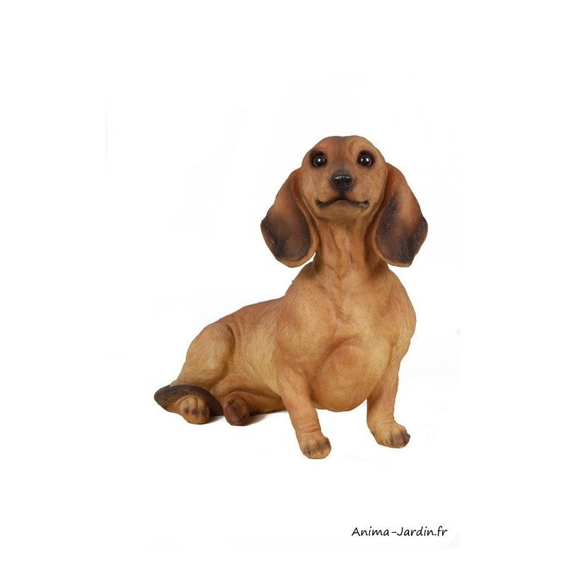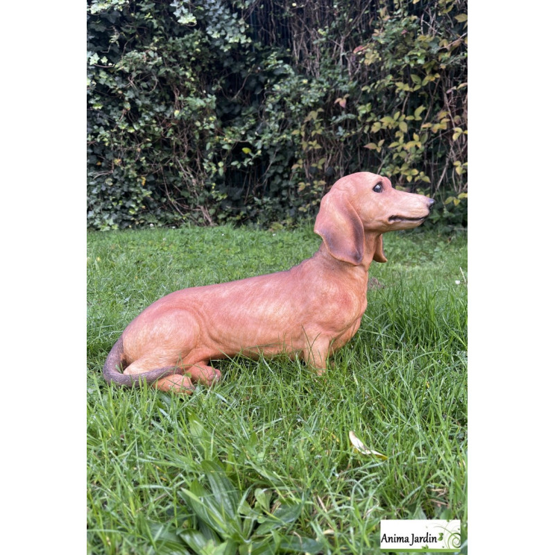 Chien en polyrésine d'une hauteur de 32,5 cm, parfait pour la décoration de votre jardin. Ce chien Teckel est très réaliste. Produit parfaitement adapté à un usage intérieur comme extérieur. Sujet en polyrésine, résistant aux intempéries et au gel.