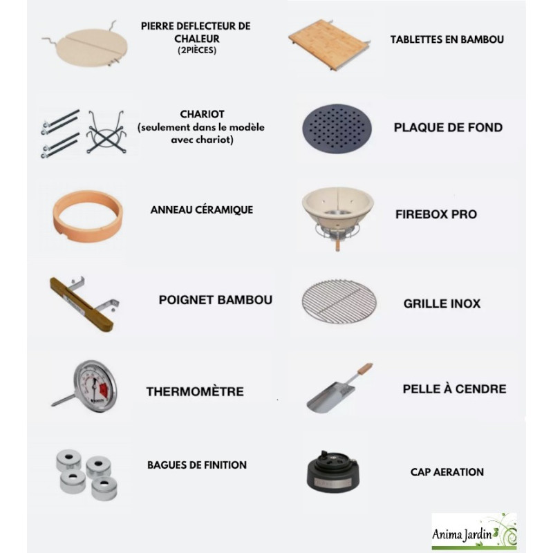 Livré avec de nombreux accessoires, il comprend notamment une grille inox, une pierre déflecteur demi-ronde, une firebox pro, une plaque de fond, une poignée en bambou, un thermomètre intégré ainsi qu'une pelle à cendres.