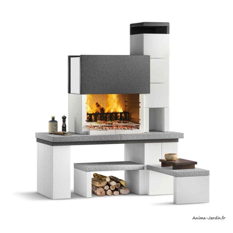 Fabriqué en béton réfractaire et granulés de marbre, il résiste aux fortes températures et aux intempéries. Son plan de travail en Marmotech poli et son grand banc latéral offrent à la fois confort d’utilisation et esthétisme moderne.