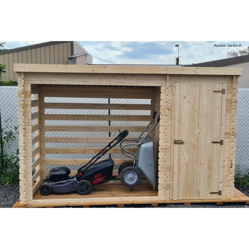 Magnifique abri en bois multifonction. Il sert de remises à outils d'une surface de 0,84 m² ainsi que de stockage à bois d'une surface de 1,31 m².