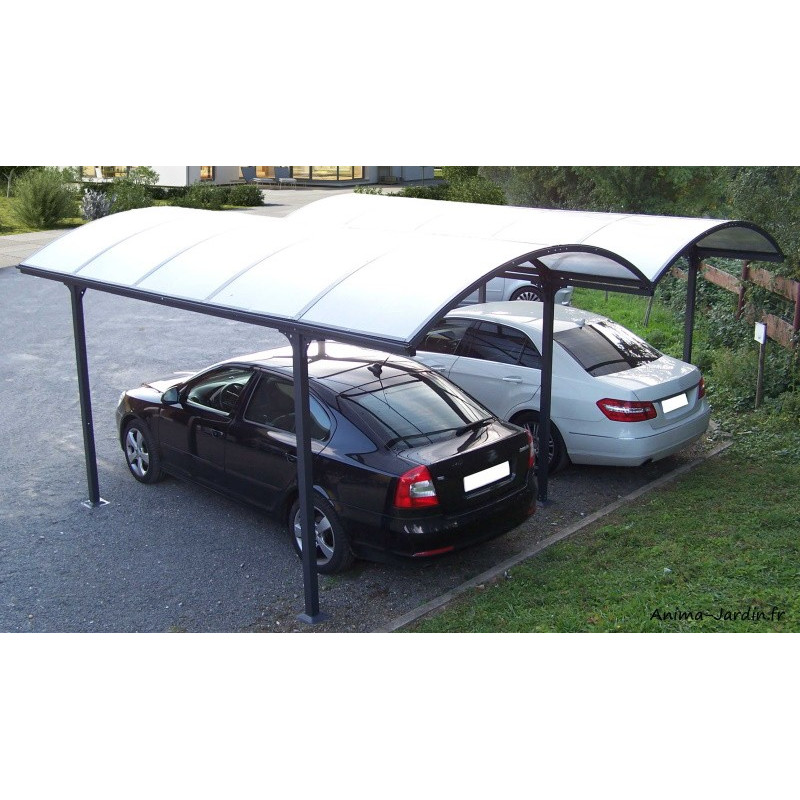 Carport moderne de couleur gris anthracite au toit arrondit d'une capacité de deux voitures. Abritez vos véhicules des aléas météorologiques (pluie, neige ou UV). Protégez vos véhicules de la pluie, de la neige ainsi que du soleil grâce à son toit en polycarbonate anti-UV. De couleur anthracite, il s'adaptera parfaitement à votre extérieur.