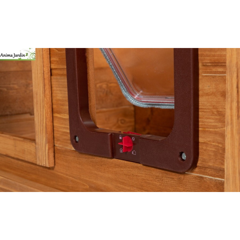La niche est équipée d'une fenêtre de 16,50 x 18 cm et d'une porte de 15 x 15 cm, permettant une bonne circulation de l'air tout en offrant une vue agréable à votre chat. Le toit en asphalte de couleur verte ajoute une touche esthétique tout en offrant une protection supplémentaire contre les intempéries. Le coloris naturel du bois s'intègre parfaitement dans n'importe quel jardin ou espace extérieur.