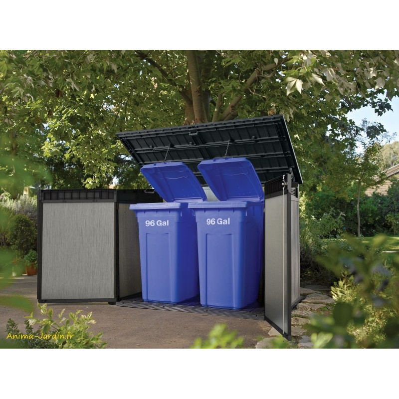 Le grand volume de ce coffre, la double porte et le système de vérins permettent une utilisation en tant que cache-poubelles ou bien encore en tant qu'abri vélos.