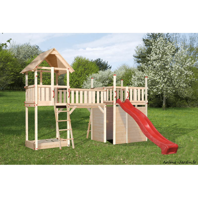 Superbe aire de jeux pour enfant. Composée d'une tour couverte, d'une tour plate reliée par un pont, vos enfants s'amuseront comme des petits fous ! Une structure complète avec un bac à sable, une maisonnette abritée par la tour ainsi qu'un toboggan. Parfaite pour l'épanouissement de vos enfants. Cette structure mesurant 3,31 m de haut et 4,5 m de large, sera parfait pour votre extérieur. Elle apporte un esprit naturel dû à son bois.