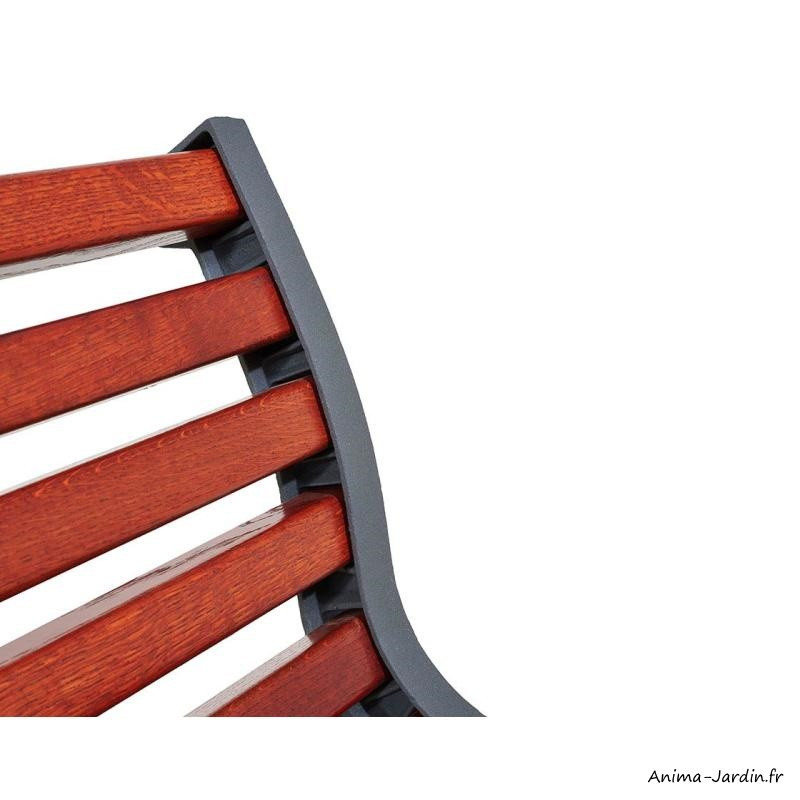 | Structure | Structure en fonte d'acier peint sur zinc, finition noir Assise et dossier en bois exotique, épaisseur 40 mm Composé de 10 lames |