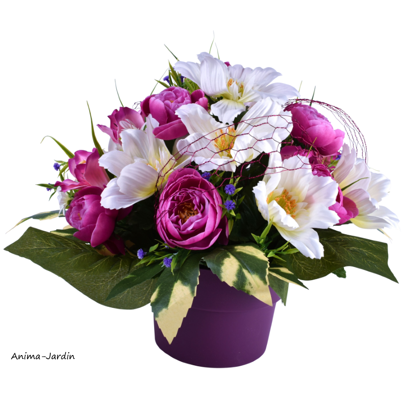 Superbe composition de fleurs artificielles, très proche de la réalité, très ressemblant. Idéale pour décorer votre terrasse, balcon ou les abords de votre maison. Matière tergal, résistante aux intempéries, pluie et soleil.