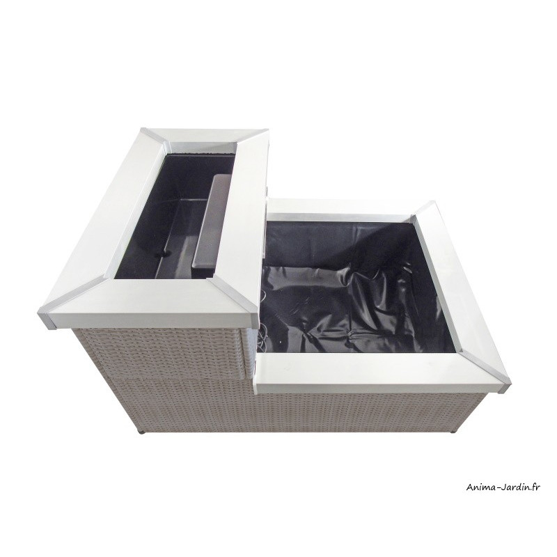 L'éclairage est un élément essentiel pour mettre en valeur à la fois la résine tressée et les bords en aluminium de la fontaine. Cela crée une ambiance visuelle qui sublime l’aspect moderne de ces matériaux.