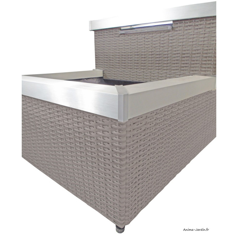 - Bande LED autour des bords en aluminium : Pour souligner le contraste entre la résine tressée et l’aluminium, pensez à installer une bande LED le long des bordures en aluminium. Cela créera un effet de halo lumineux qui mettra en valeur les détails métalliques.