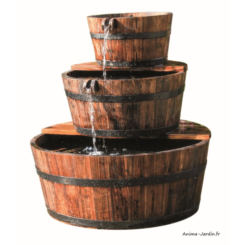 Superbe fontaine rustique en bois naturel. Ce jeu d'eau se compose de trois demi-tonneaux de tailles différentes dans lequel l'eau s'écoule du premier au dernier tonneau. Les demi-tonneaux sont constitués chacun d'un petit bassin. Parfait pour se rafraichir l'été, il sublimera votre extérieur en lui donnant une touche naturelle. Petit comme grand, profitez de cette magnifique fontaine grâce à ses différentes hauteurs.