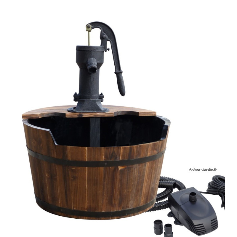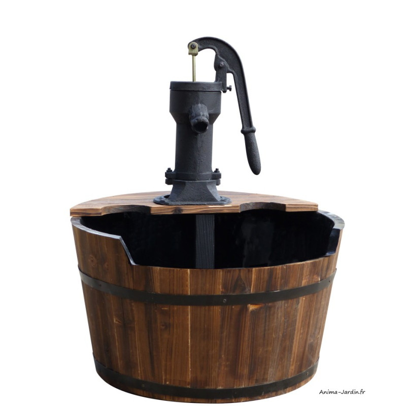 Charmante fontaine rustique en bois avec son bras noir mat. Ce jeu d'eau permet un écoulement en continu grâce à l'eau qui jaillit du bras. Il sublimera votre extérieur et apporte une touche naturelle à votre jardin.