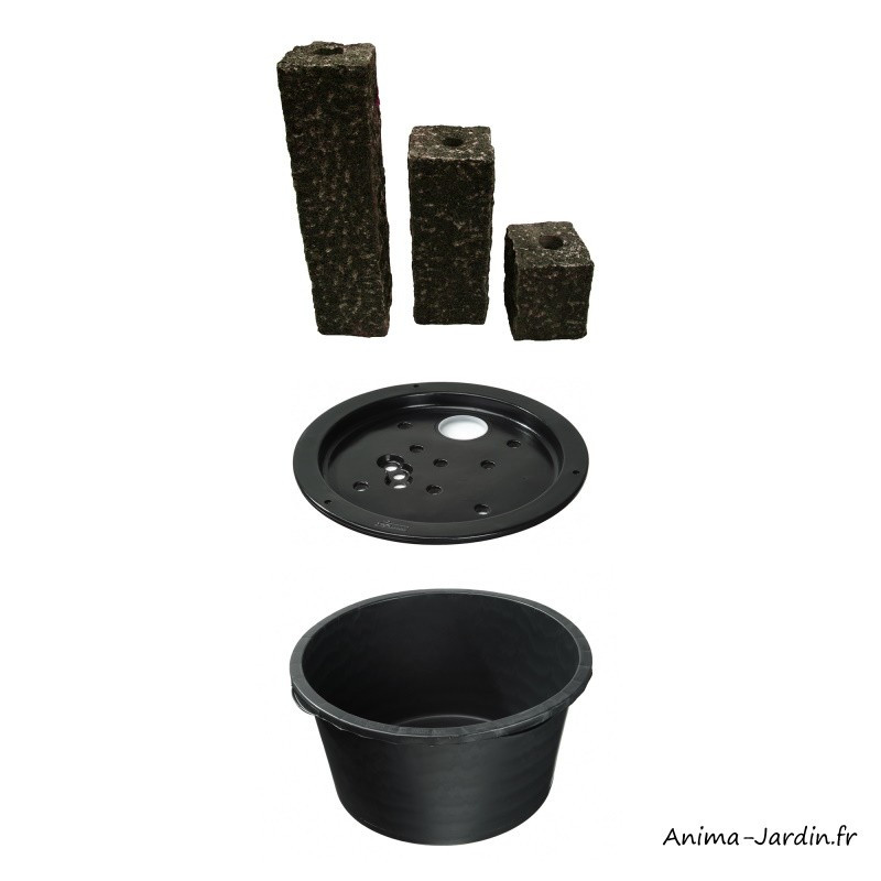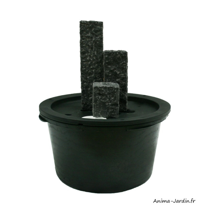 Magnifique fontaine en pierre taillée dans un bloc de granite. Idéal pour votre extérieur, elle apporte une touche de modernité due à ses trois hauteurs différentes. Les colonnes offrent de belles variations de couleurs bleutées noire, sublimées à la nuit tombée par un éclairage LED.