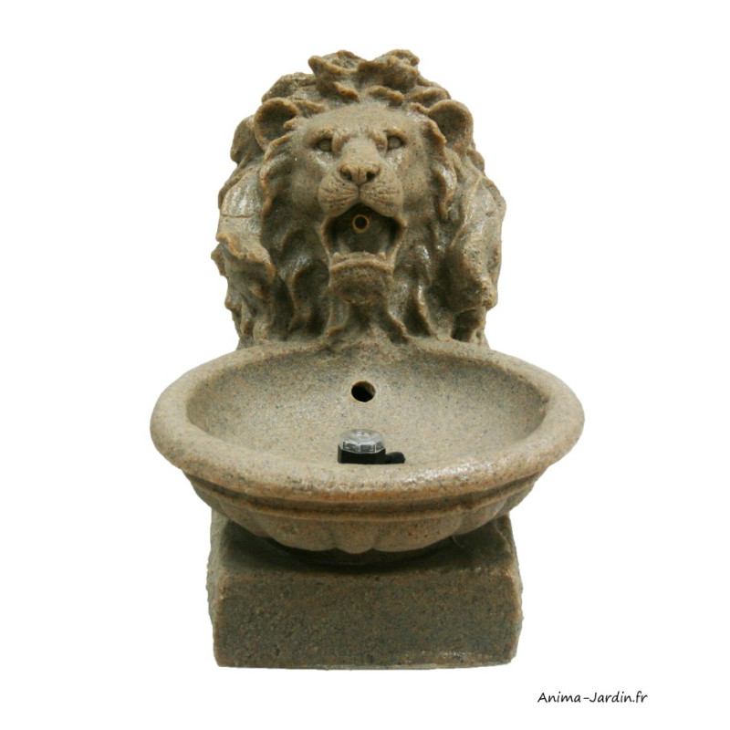Charmante fontaine d'aspect grès. Vous serez charmé par sa gargouille en tête de lion. Relaxez-vous et détendez-vous par le ruissellement continu de l'eau jaillissant du lion. Ses LED intégrées viendront sublimer vos soirées.
