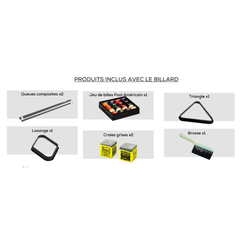 | Accessoires inclus | - 2 queues - Jeu de billes Pool Américan - Triangle x1 - Losange x1 - Craies grises x2 - Brosse x1 |