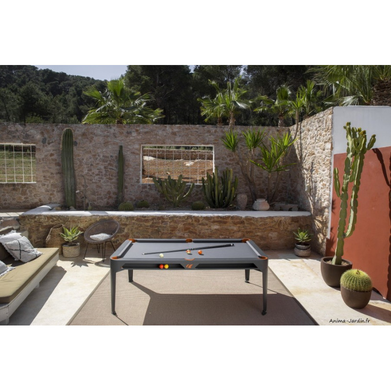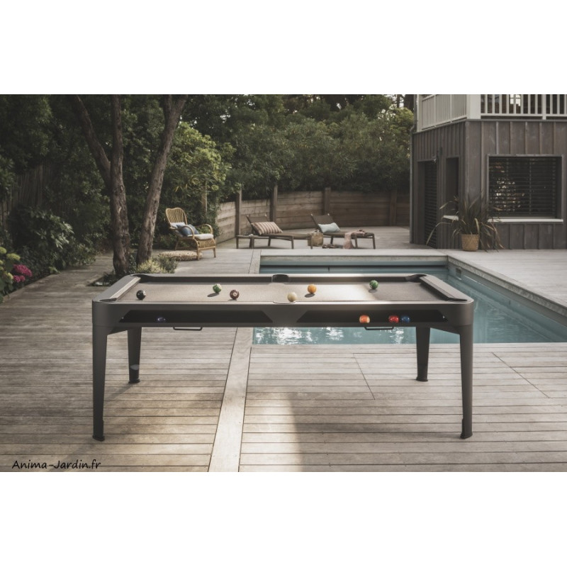 Transformez votre espace extérieur en un sanctuaire de divertissement raffiné avec notre table de billard gris anthracite, intelligemment convertible en table à manger. Conçue pour résister aux chocs et aux caprices météorologiques, cette table offre une polyvalence exceptionnelle pour répondre à vos besoins de loisirs en plein air.