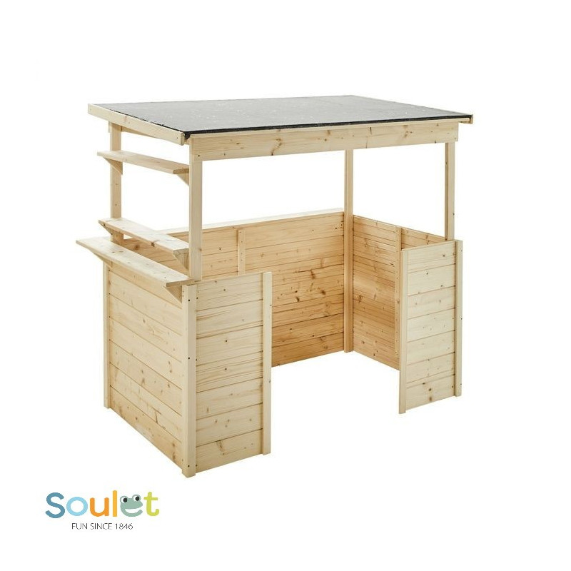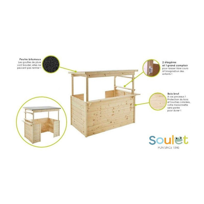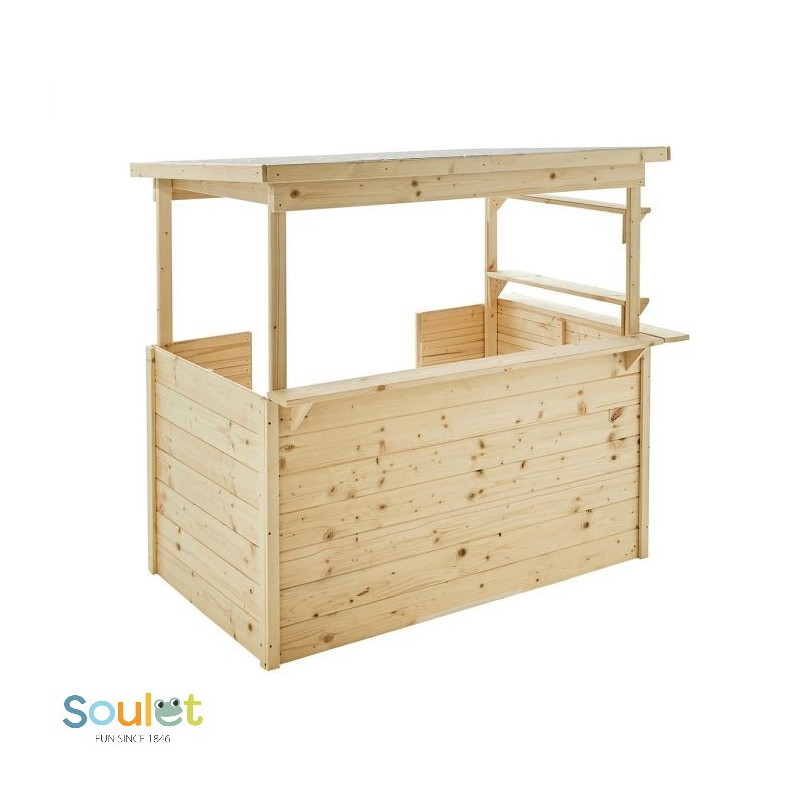 Maisonnette en bois, stand, Playa, idéale pour l'amusement de vos enfants dans le jardin, le balcon ou dans bien encore dans une cour. Cette cabane qui inspire les vacances et la convivialité est parfaite pour les moments de jeux partagés (dinette, marchande ...). Cette maisonnette en bois brut peut être personnalisée selon vos envies.
