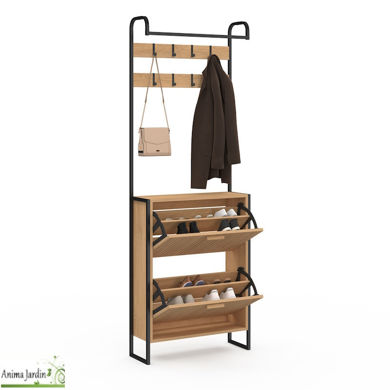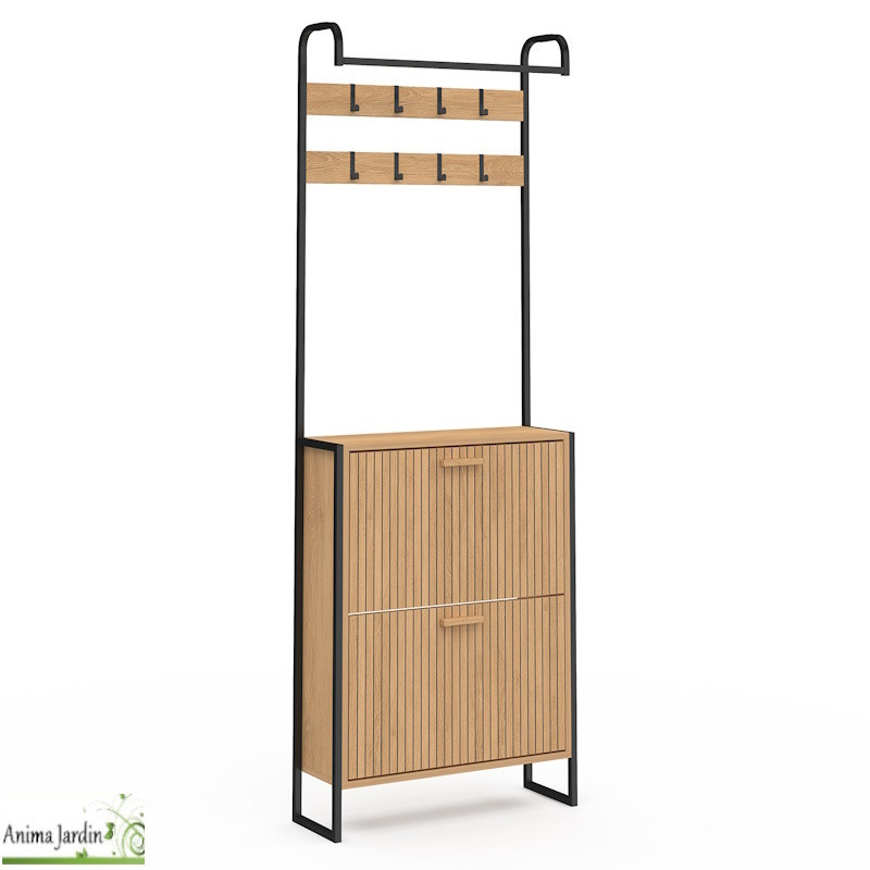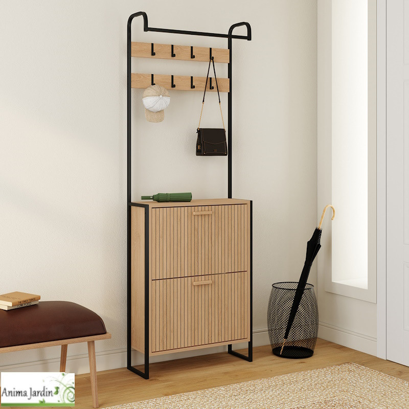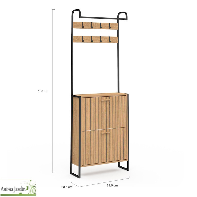 Avec ses dimensions globales de 63,50 x 23,50 x 180 cm, il s’adapte facilement aux petits espaces tout en offrant une capacité de rangement optimale. Sa partie meuble à chaussures mesure 63,50 x 23,50 x 85 cm et peut accueillir jusqu’à 12 paires.