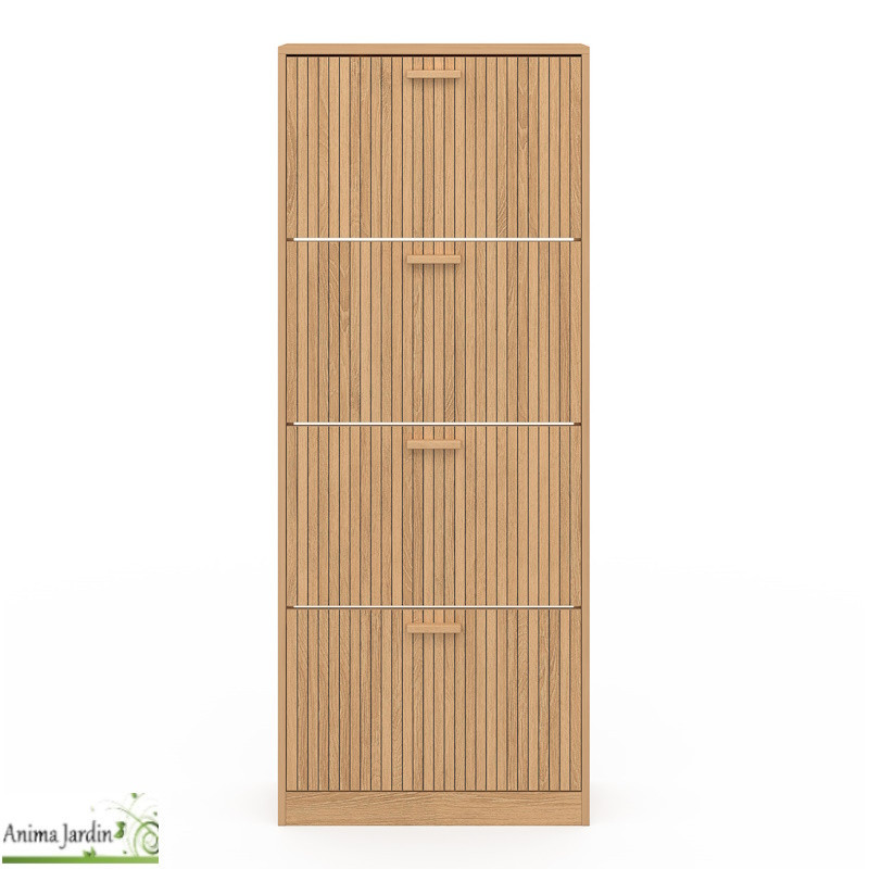 Ses dimensions globales sont de 60 x 24 x 150 cm, avec 4 portes battantes pour un accès facile et discret à vos chaussures. Les poignées en finition soignée mesurent L.10,5 x l.2 x E.1 cm pour une bonne prise en main.