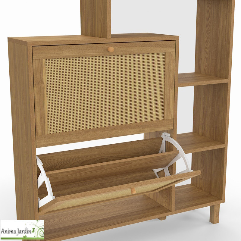 Alliez esthétique et fonctionnalité avec ce meuble à chaussures pouvant accueillir jusqu’à 12 paires. Son style mêle l’authenticité du bois et le charme du cannage pour un rendu naturel et chaleureux.