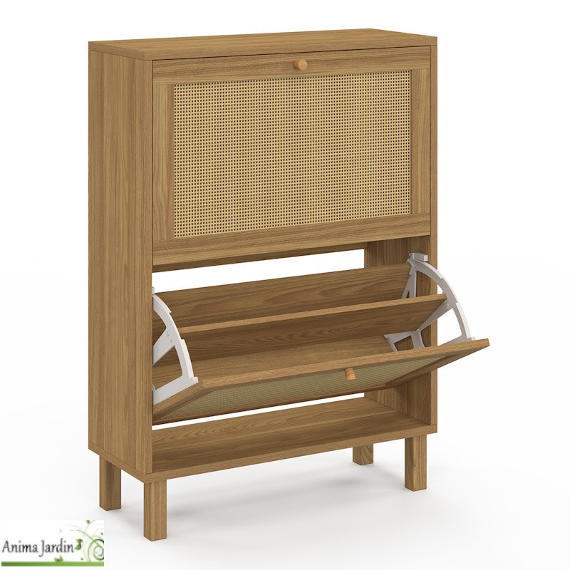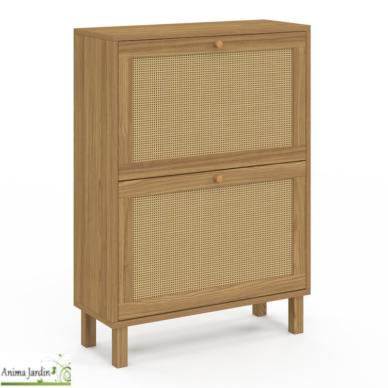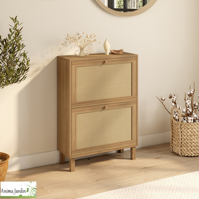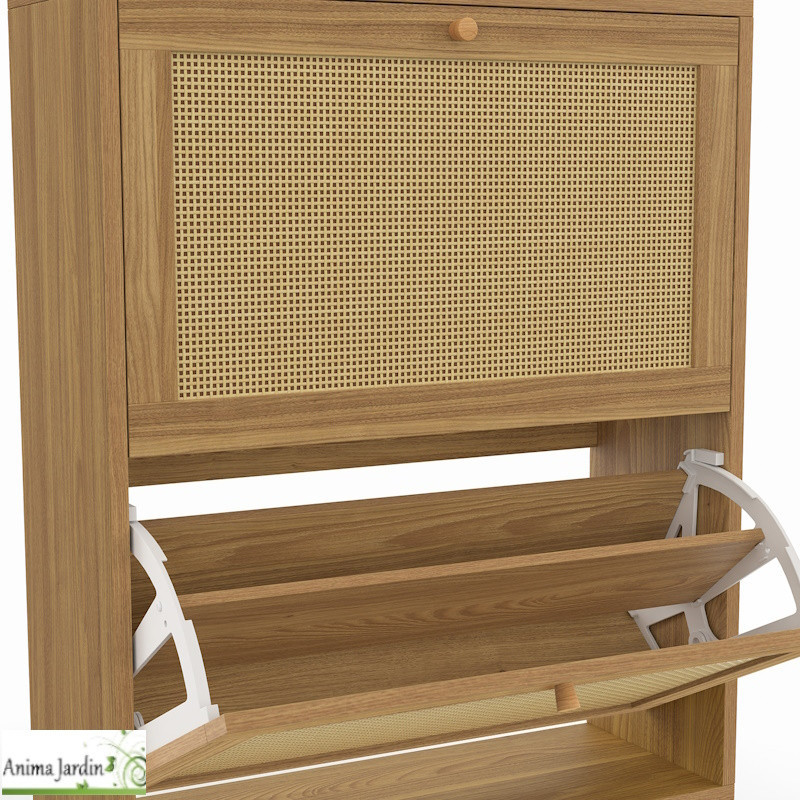 Apportez à votre intérieur une touche naturelle et élégante avec ce meuble à chaussures au design bois et cannage, capable d’accueillir jusqu’à 12 paires.
