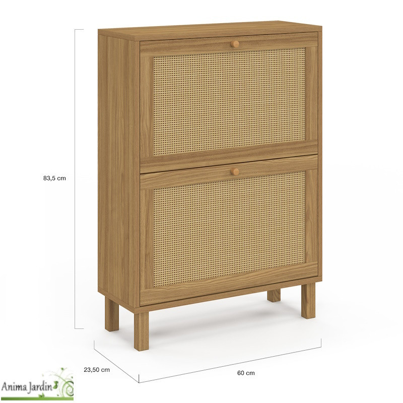 Fabriqué en panneaux de particules de 15 mm et 12 mm, avec cannage en PVC et pieds en bois de pin, il offre à la fois solidité et style. Ses dimensions globales sont de 60 x 23,50 x 83,50 cm, idéales pour un rangement optimisé dans une entrée ou un couloir.