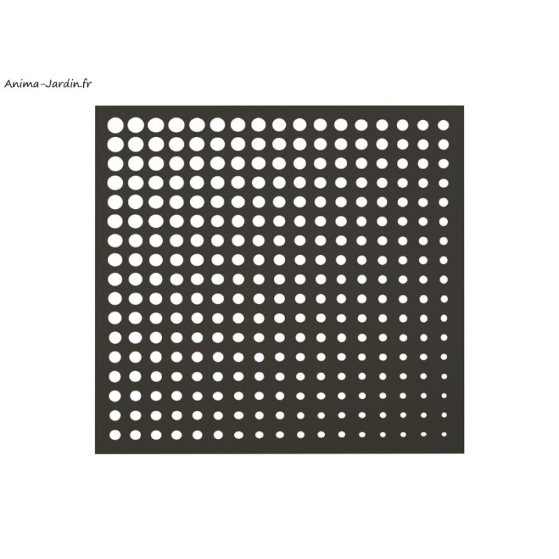 Ce panneau se distingue par ses petits cercles perforés, dont les diamètres décroissent progressivement, offrant ainsi un jeu d’ombres et de lumière aléatoire. Il assure à la fois confidentialité et esthétique contemporaine, s'intégrant parfaitement dans un jardin, une terrasse ou un balcon.