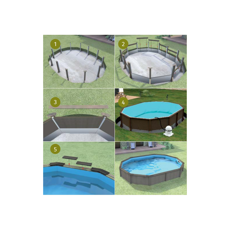 La piscine kit décagonale Naturalis 5,24 x 6,86 m en béton aspect bois combine élégance et durabilité. Avec son aspect bois naturel, elle s'intègre harmonieusement dans tous les extérieurs tout en étant résistante au gel et au dégel, sans entretien et économique.
