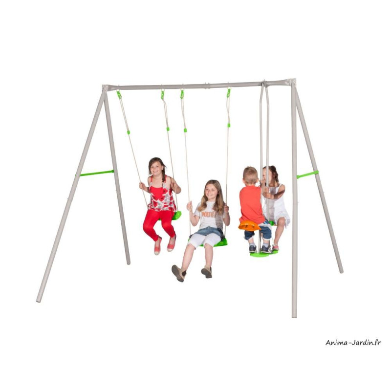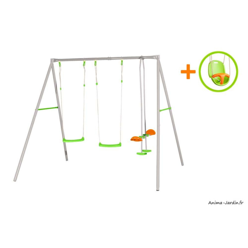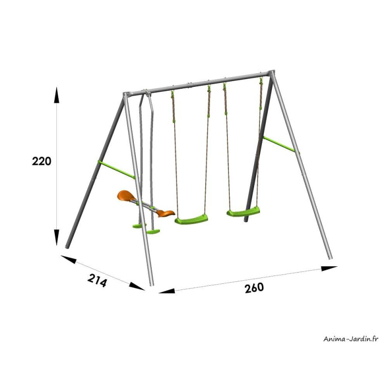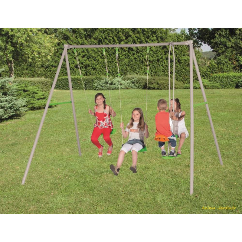 Magnifique portique en métal gris et vert. Parfait pour l'amusement de vos enfants dans votre jardin. Equipé de deux balançoires et d'un face à face (siège-bébé en option). Montage facile.