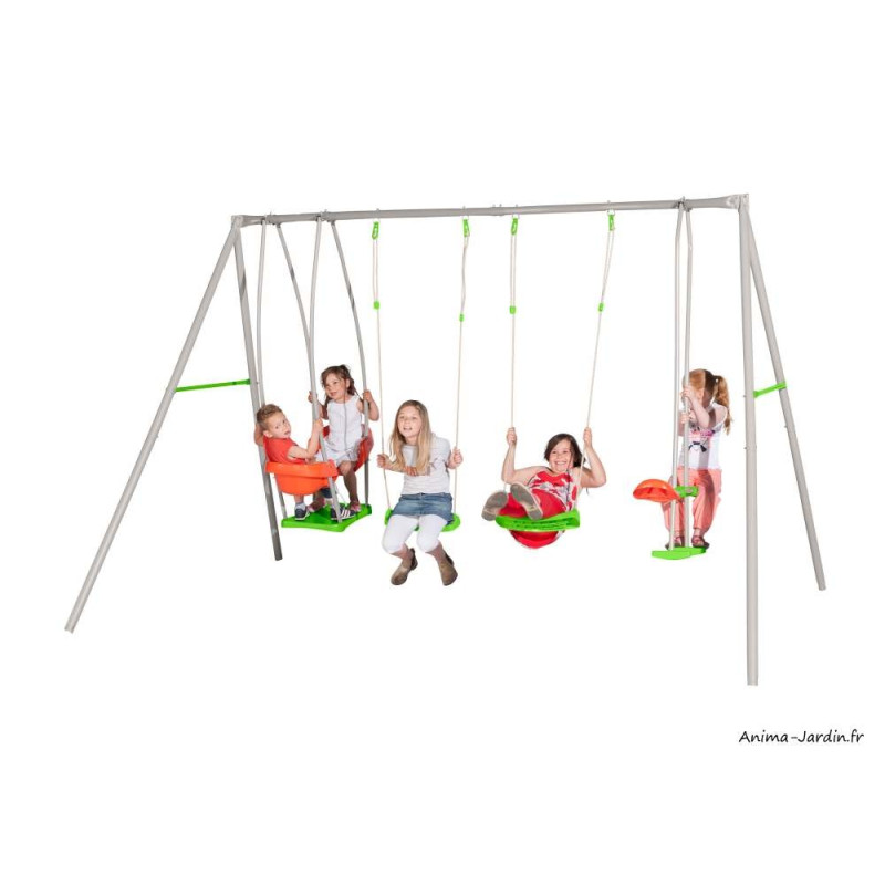 Très beau portique en métal d'une hauteur de 2,20 m. Equipé de quatre agrès: 2 balançoires, une nacelle et un siège face à face (agrès supplémentaire: siège-bébé, à choisir en option). Parfait pour l'amusement de vos enfants à l'extérieur de votre maison. Montage facile.