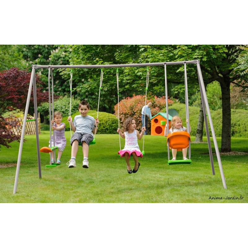 Magnifique portique en métal gris et vert. Parfait pour l'amusement de vos enfants dans votre jardin. Equipé de deux balançoires et d'un face à face (siège-bébé en option). Montage facile.