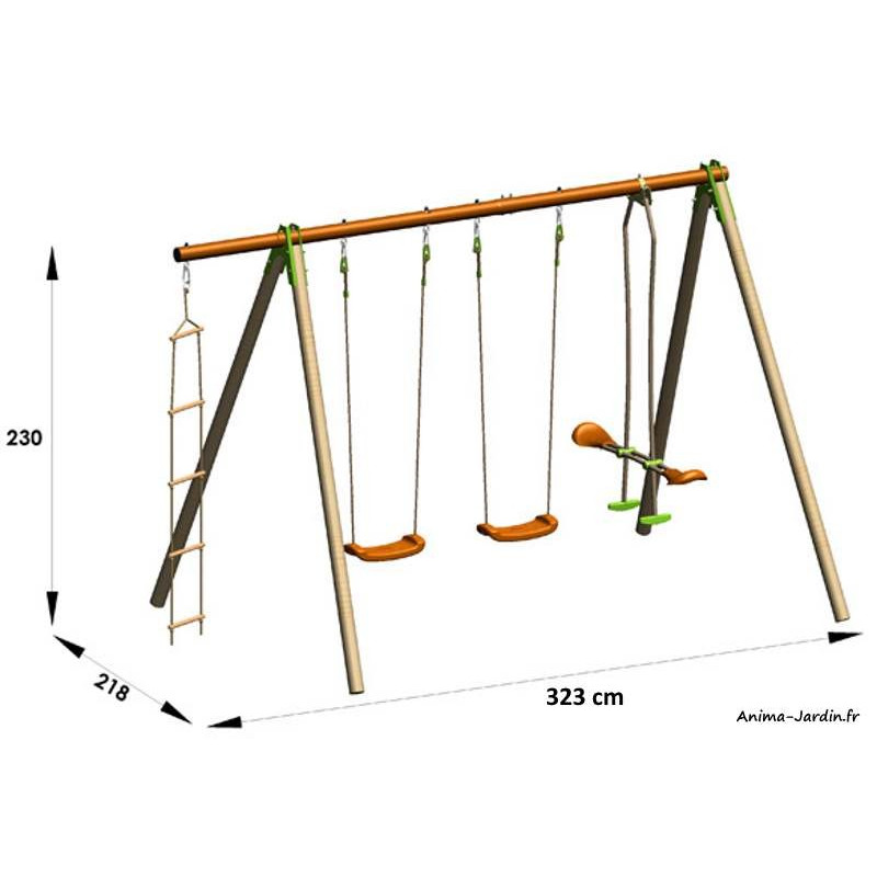 Très beau portique en métal d'une hauteur de 2,20 m. Equipé de quatre agrès: 2 balançoires, une nacelle et un siège face à face (agrès supplémentaire: siège-bébé, à choisir en option). Parfait pour l'amusement de vos enfants à l'extérieur de votre maison. Montage facile.