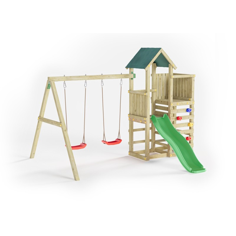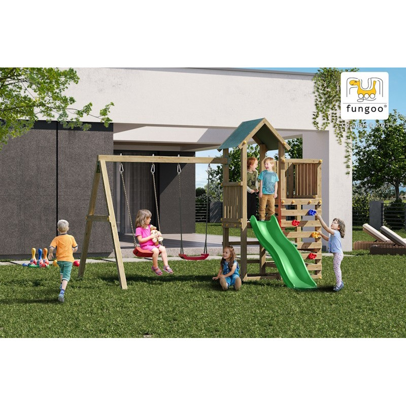 L'aire de jeux en bois Chester de Fungoo est l'option parfaite pour divertir vos enfants tout en assurant leur sécurité. Ce portique complet intègre une balançoire double, une tour, un mur d'escalade, un bac à sable, et un toboggan vert de 2,20 m (dont 1,75 m de glisse). Il offre ainsi un large choix d'activités pour stimuler l'imagination et l'activité physique des petits.