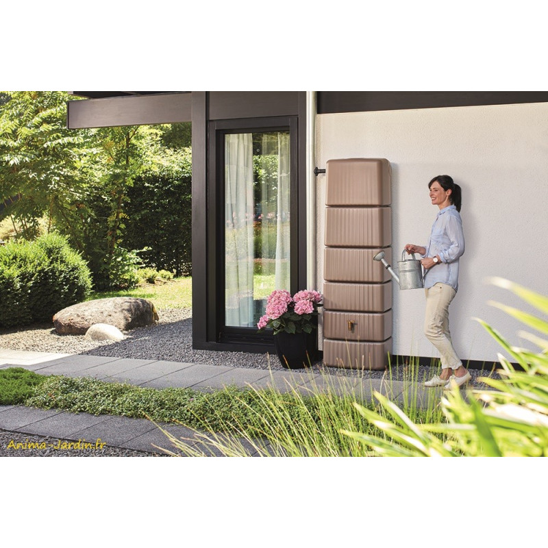 Superbe réservoir d'eau de pluie, Woody, d'une capacité de 350L. Ce récupérateur d'eau en imitation bois sera parfait pour votre extérieur. Grâce à lui, vous pourrez arroser vos fleurs et vos plantes tout en faisant des économies.