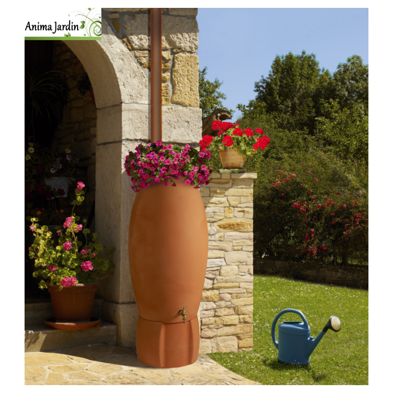 Le récupérateur d'eau de pluie Amphore ANTIK de GRAF est décoratif, il rappelle les poteries du sud, terres anciennes, aspect vieilli par le temps.