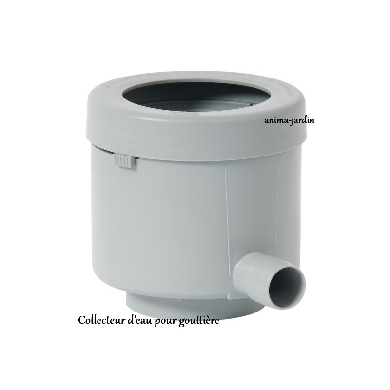 Ouverture prédécoupée à ouvrir selon le diamètre de la gouttière Ø 80 ou 100 mm. Sortie latérale 1" (Ø 25 mm), avec tuyau et embout de raccordement à la cuve. Hauteur 11,5 cm | ø 13 cm – Distance minimale entre la gouttière et le mur : 16 mm