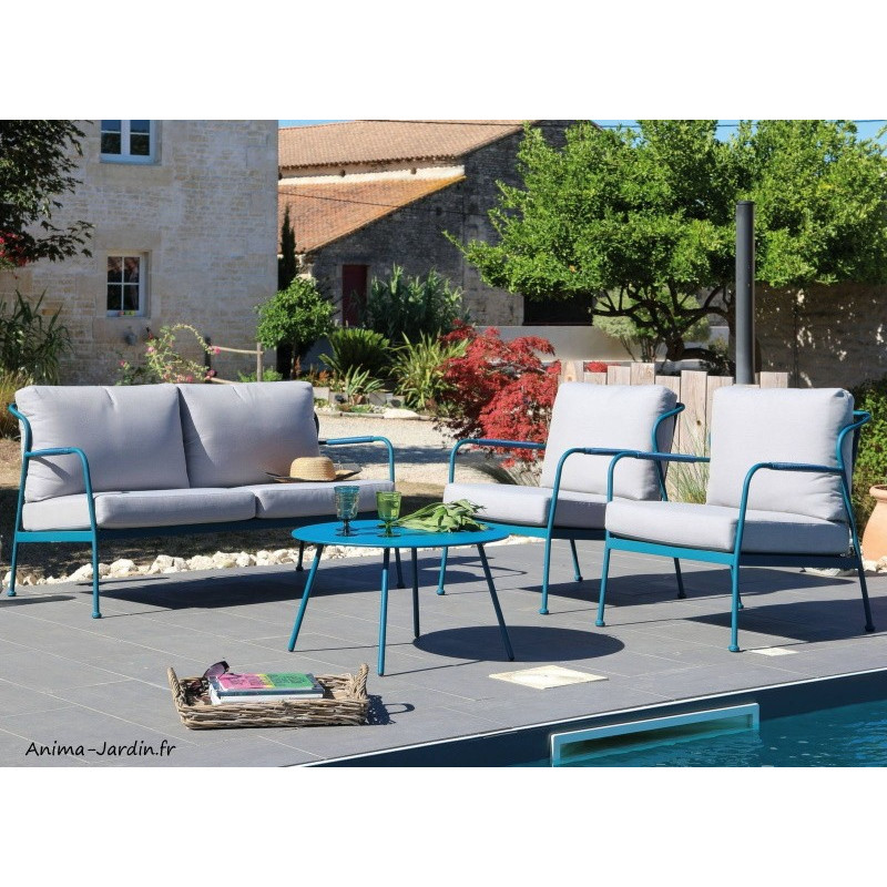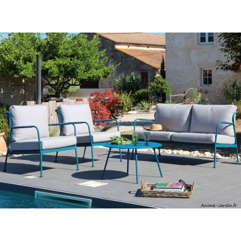 Découvrez ce salon de jardin en acier bleu ou vert à la structure contemporaine. Équipé d'un canapé ainsi que de deux fauteuils et d'une table basse, ce salon fera tout son effet dans votre extérieur avec sa couleur éclatante.