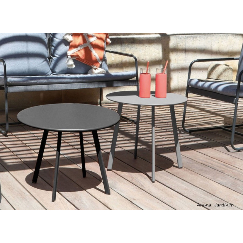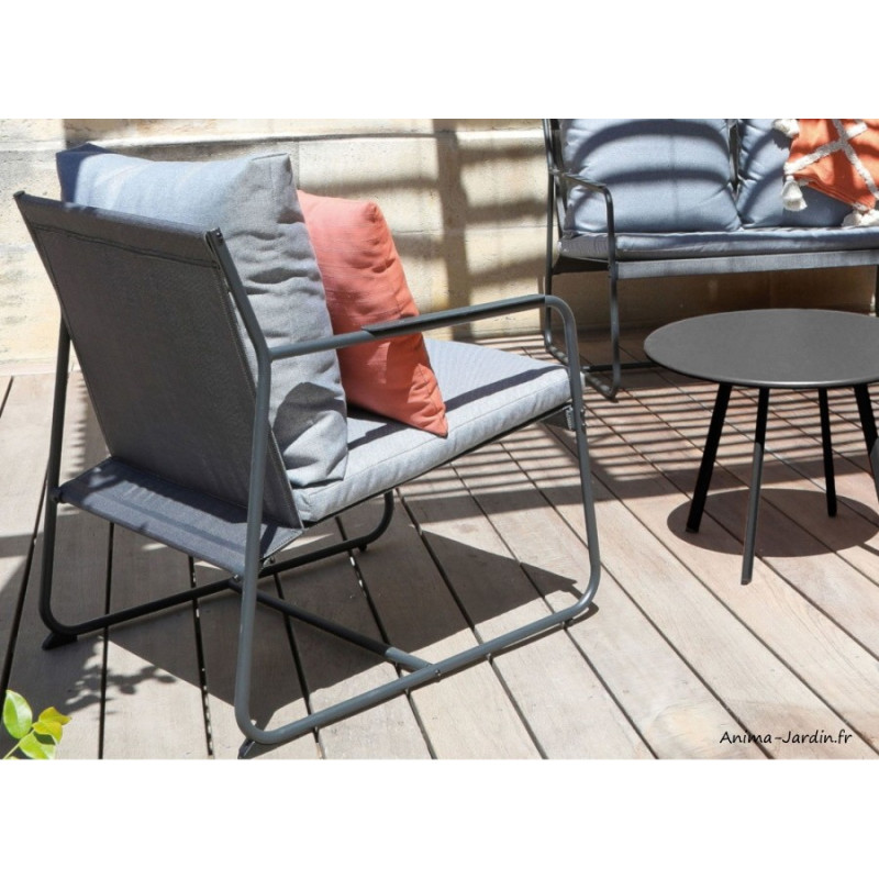 Superbe salon de jardin Bali en acier gris, conçu pour accueillir confortablement 4 personnes. Cet ensemble élégant se compose d'un canapé, de deux fauteuils et de deux tables gigognes rondes, offrant un espace convivial pour profiter de votre extérieur en toute simplicité.