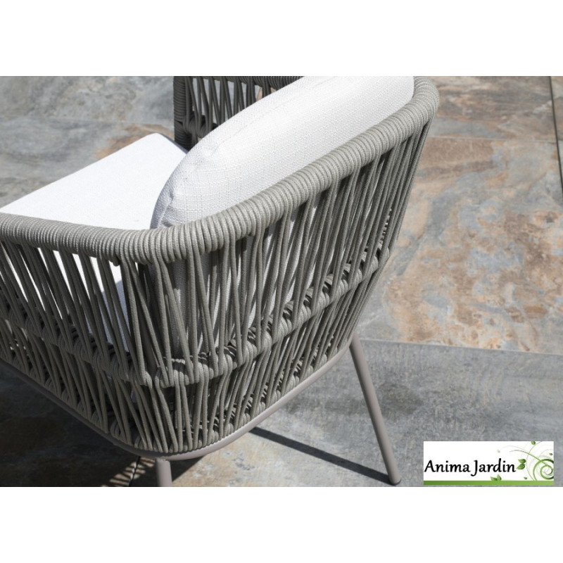 Le dossier et les accoudoirs sont habillés de cordes rondes et souples en résine synthétique, offrant un mélange harmonieux entre un style authentique et une esthétique contemporaine.