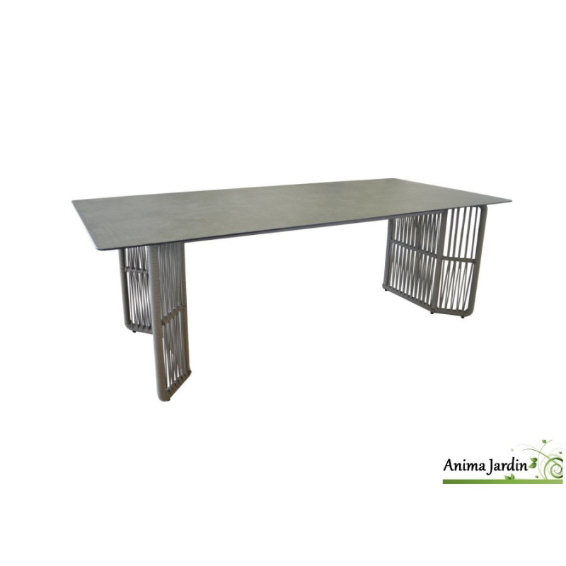 Embellissez votre espace extérieur avec la splendide table de jardin Iris, dotée d'une structure en cordes kaki et d'un plateau en verre trempé finition céramique. Cette table peut accueillir jusqu'à 8 convives !